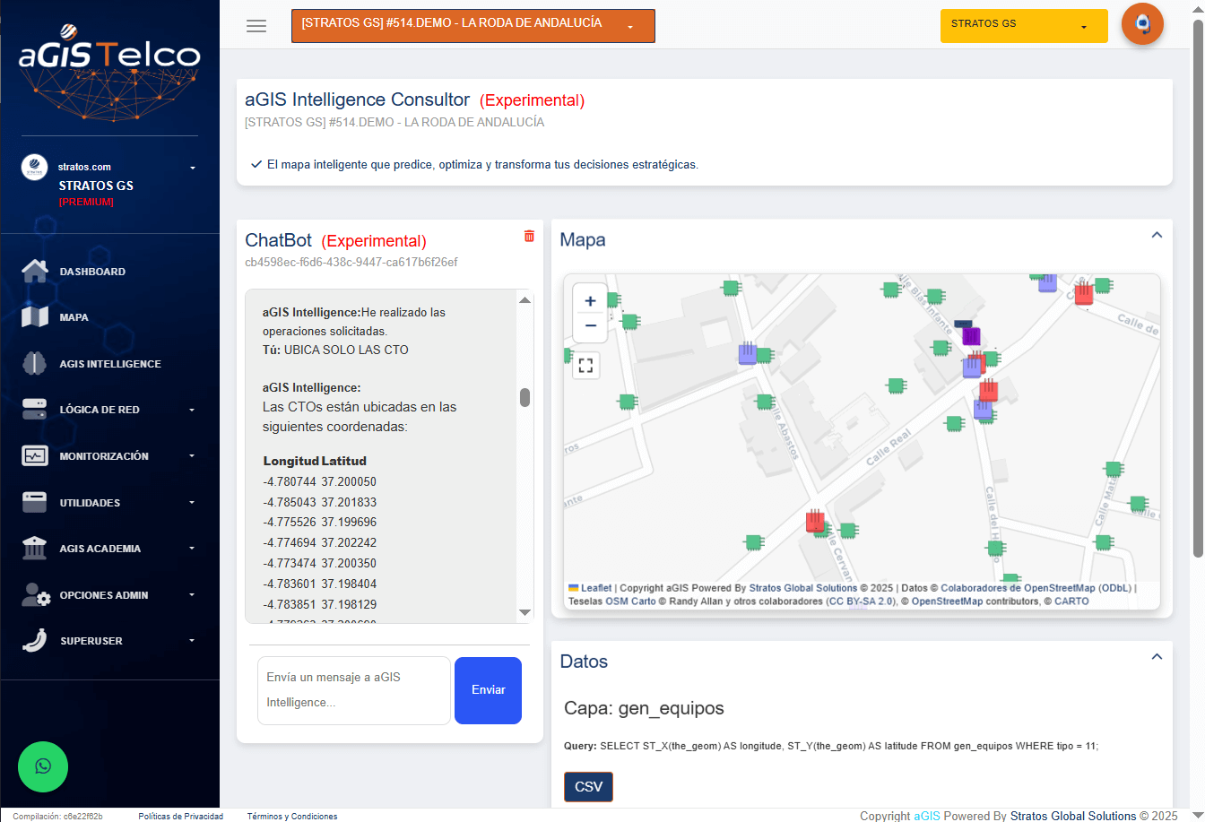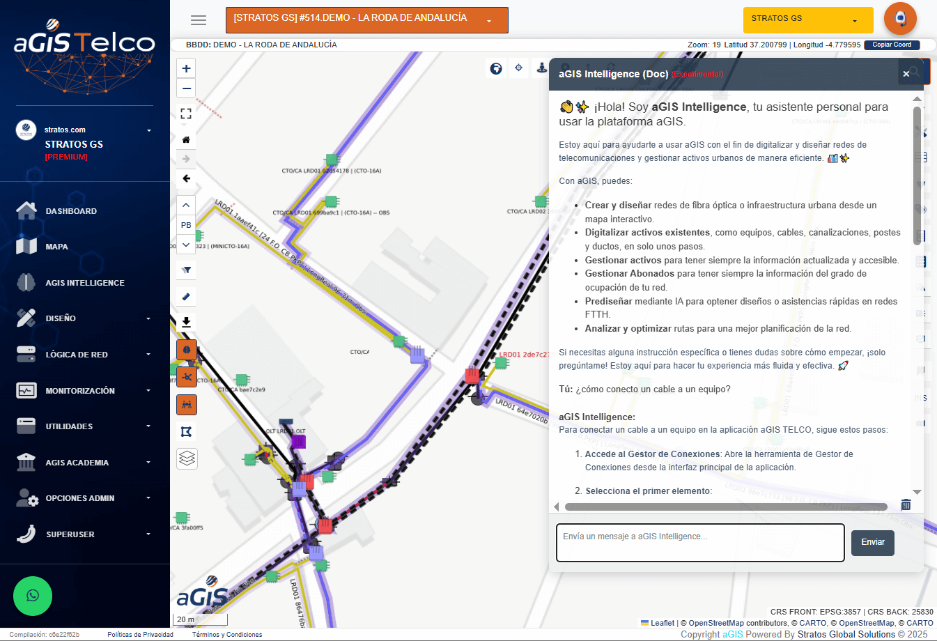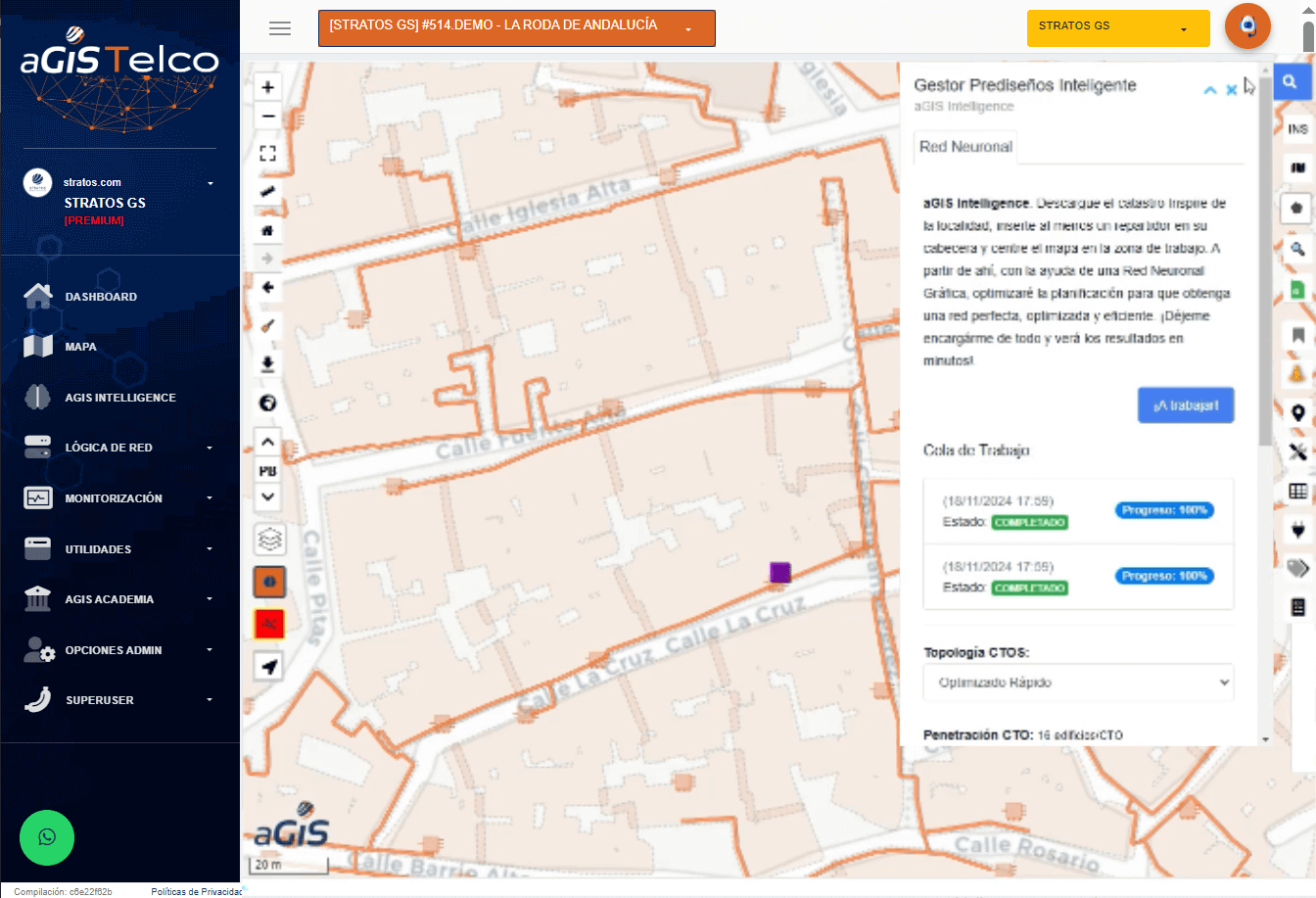 aGIS TELCO, SaaS orientado no solo al diseño de fibra óptica, sino al de cualquier tipo de red de telecomunicaciones (FTTH, fibra oscura, radioenlaces, WiFi, WiMax, emplazamientos...), es una plataforma moderna totalmente web y cloud, pudiéndose así utilizar desde cualquier lugar, que pretende llevar las tecnologías de geolocalización más avanzadas a operadores Telco.